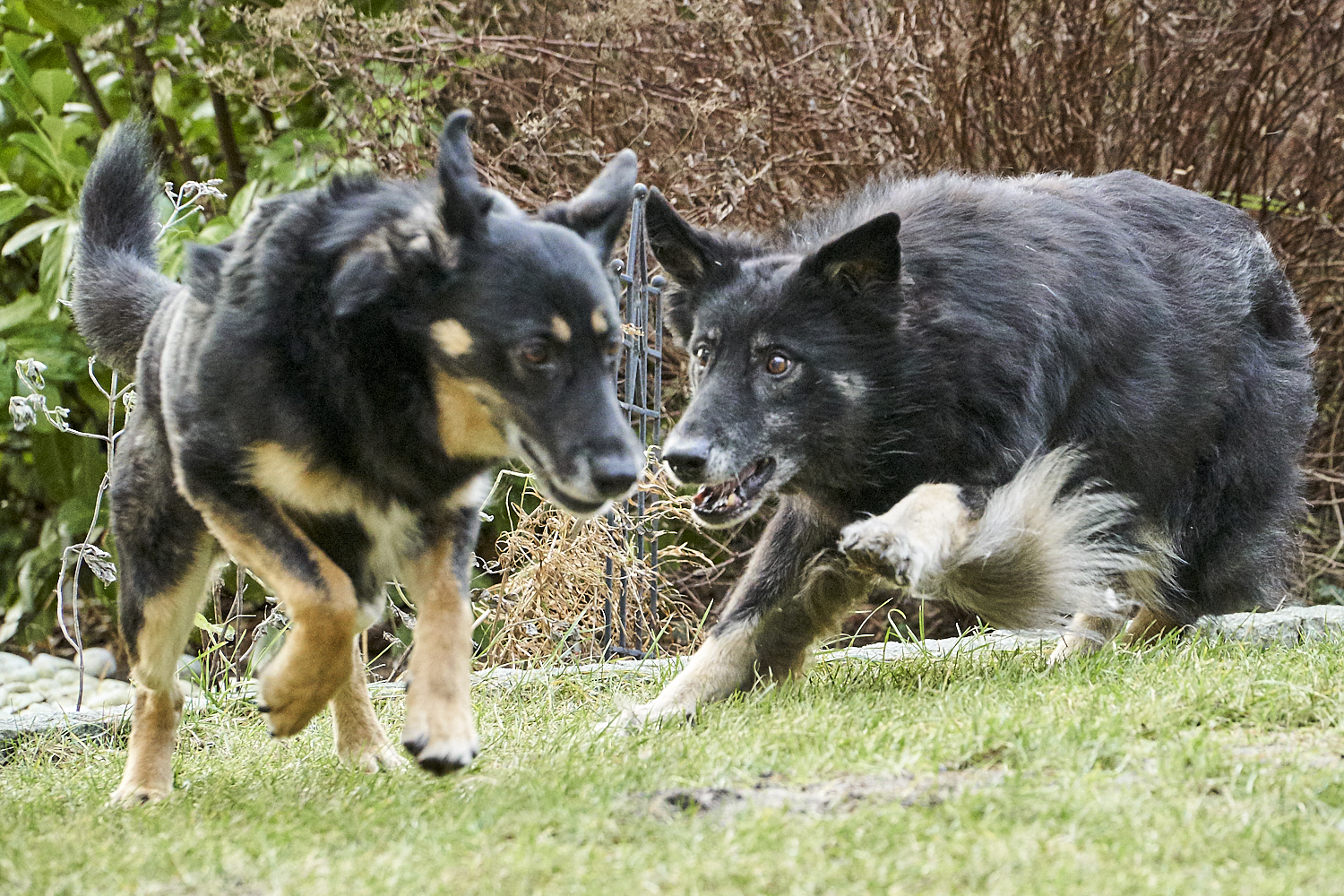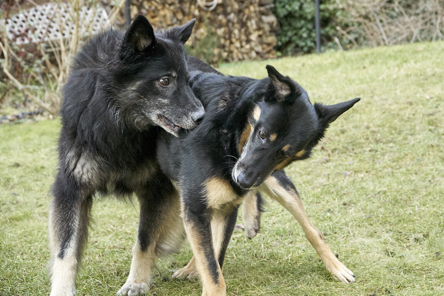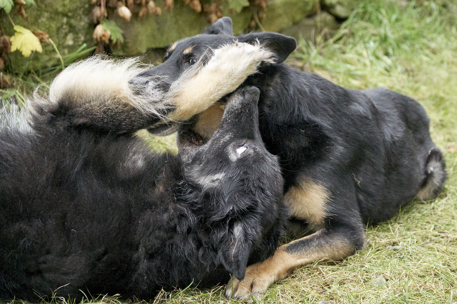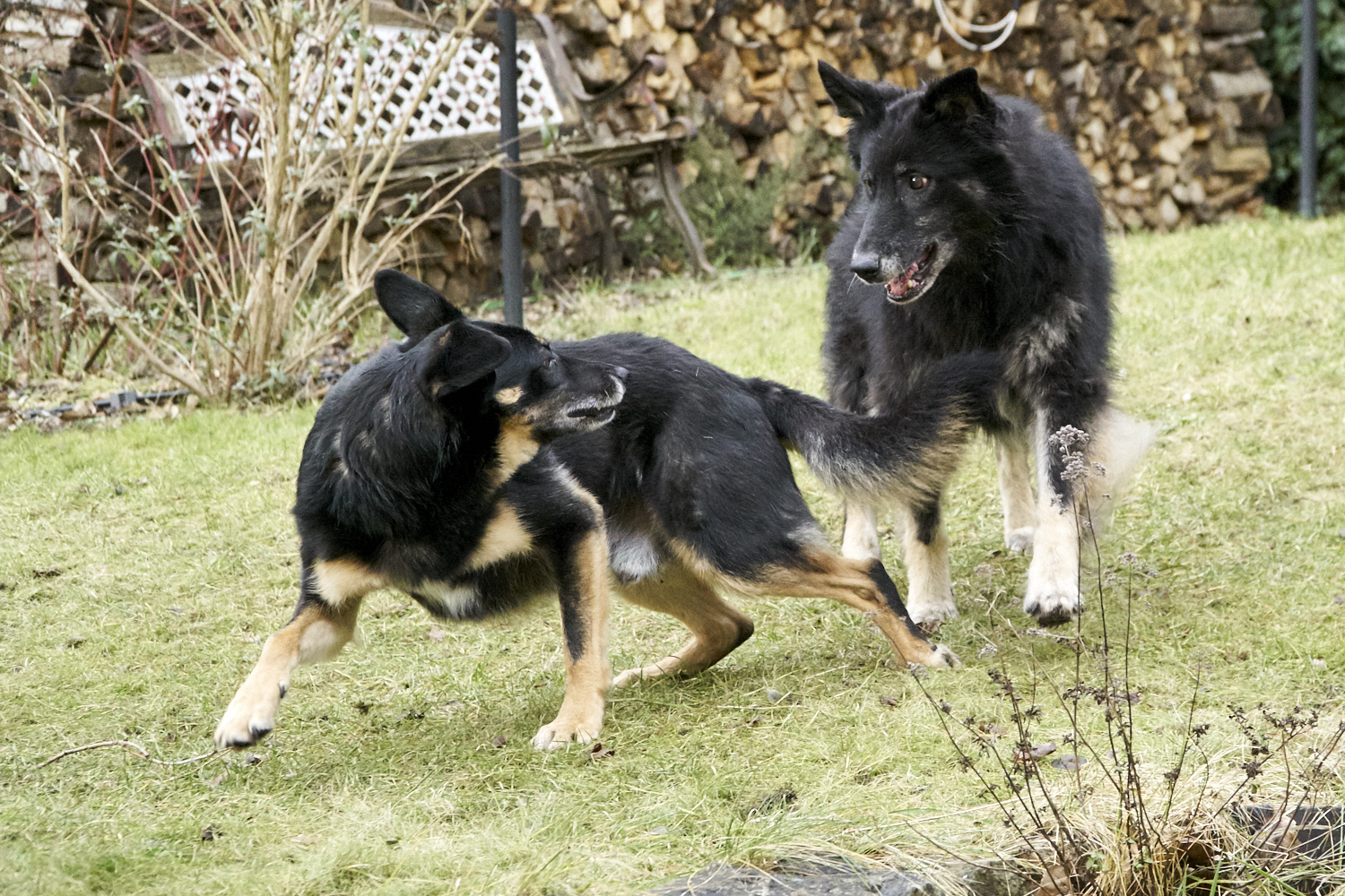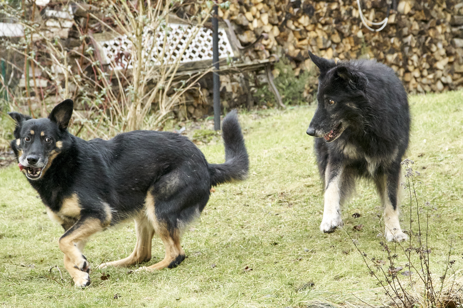 Hana (t), Klempo (t), Fee (vormals Mia) und Rocky, vier Hunde aus dem Tierschutz