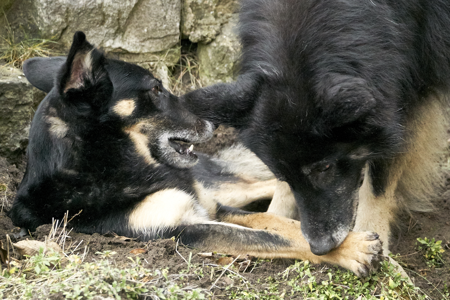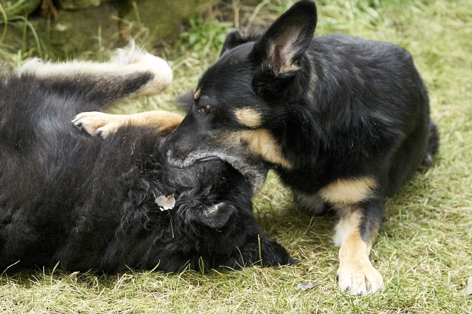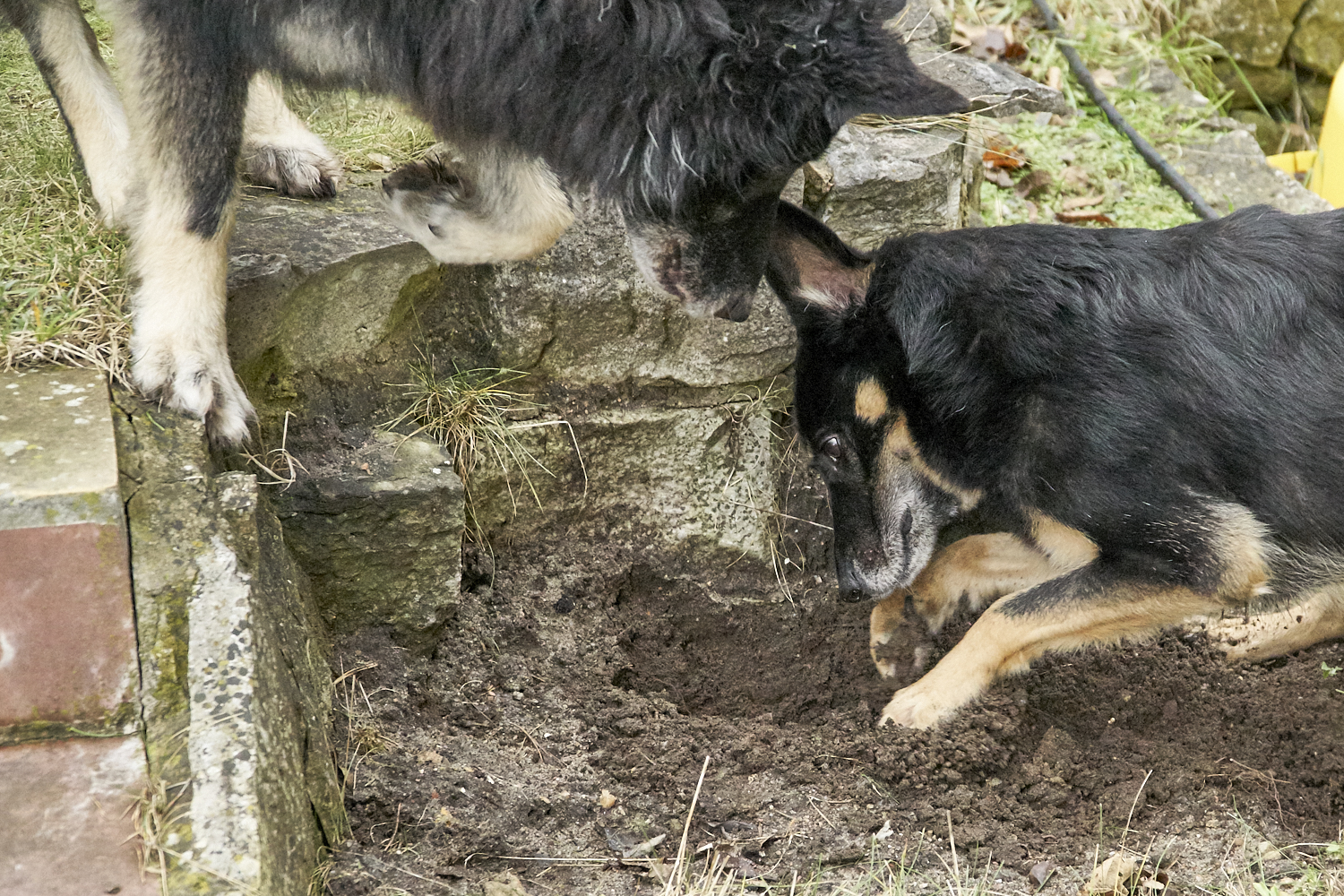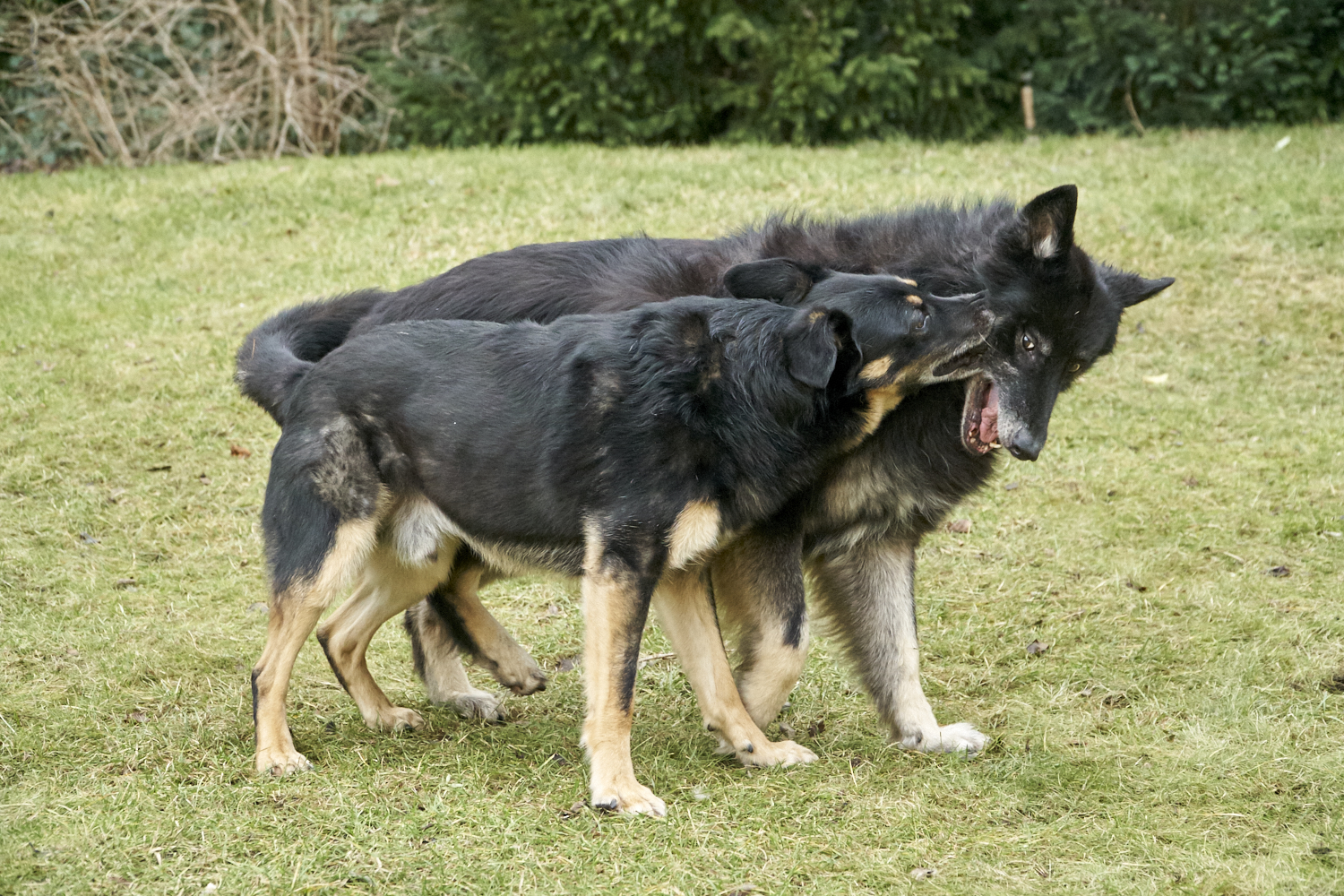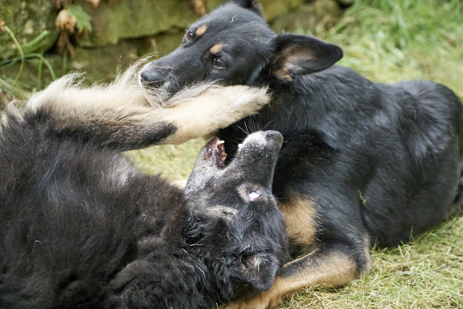 Hana (t), Klempo (t), Fee (vormals Mia) und Rocky, vier Hunde aus dem Tierschutz