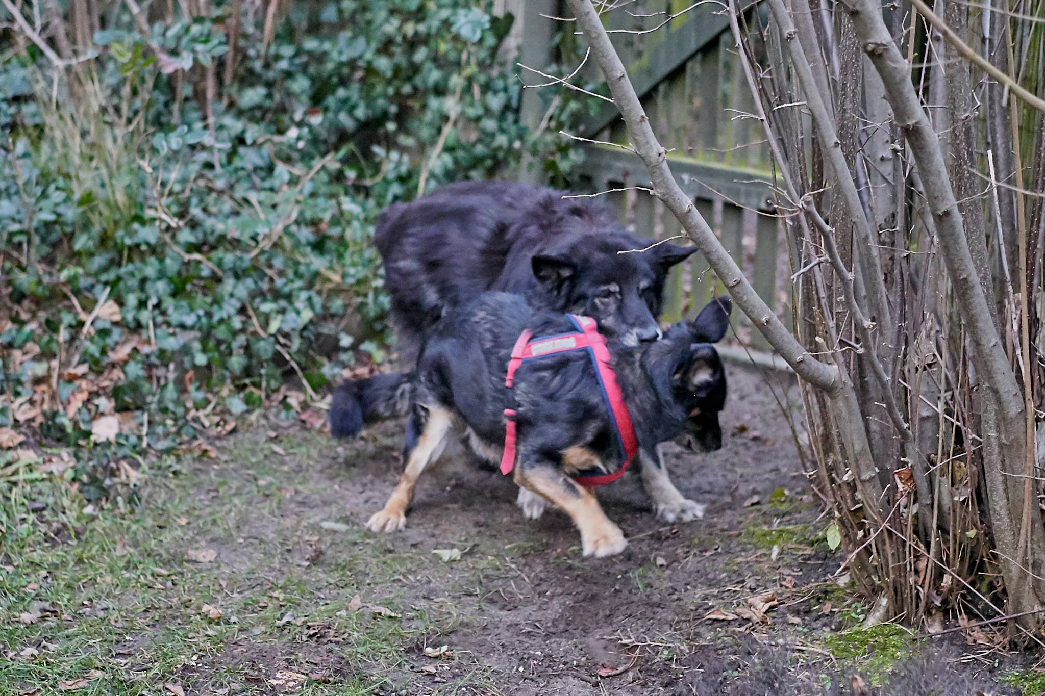 Hana (t), Klempo (t), Fee (vormals Mia) und Rocky, vier Hunde aus dem Tierschutz