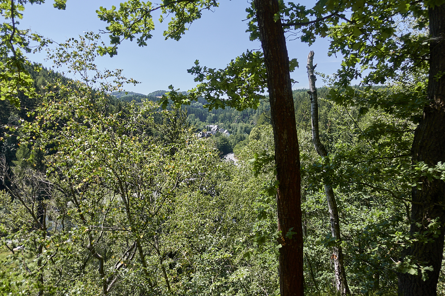 Zuerst hinab nach Hopfgarten und dann auf breiten Wegen wieder hinauf in die Wolkensteiner Schweiz.