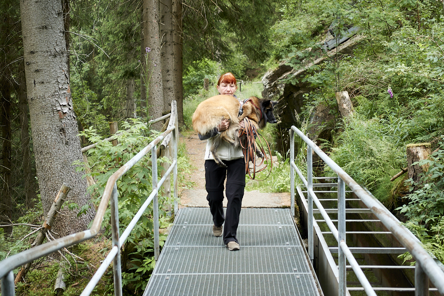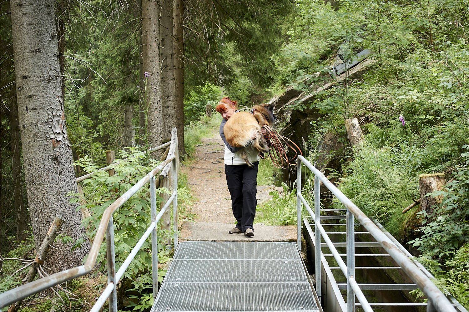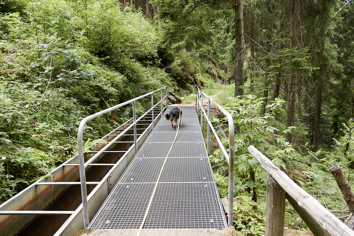 Auf dem Rückweg ging es über den Kammweg entlang eines Baches. Der Weg war recht schmall und an einigen Stell mussten Gitter überquert werden. Klempo hatte kein Problem mit den Gitter. Immer vorne weg.